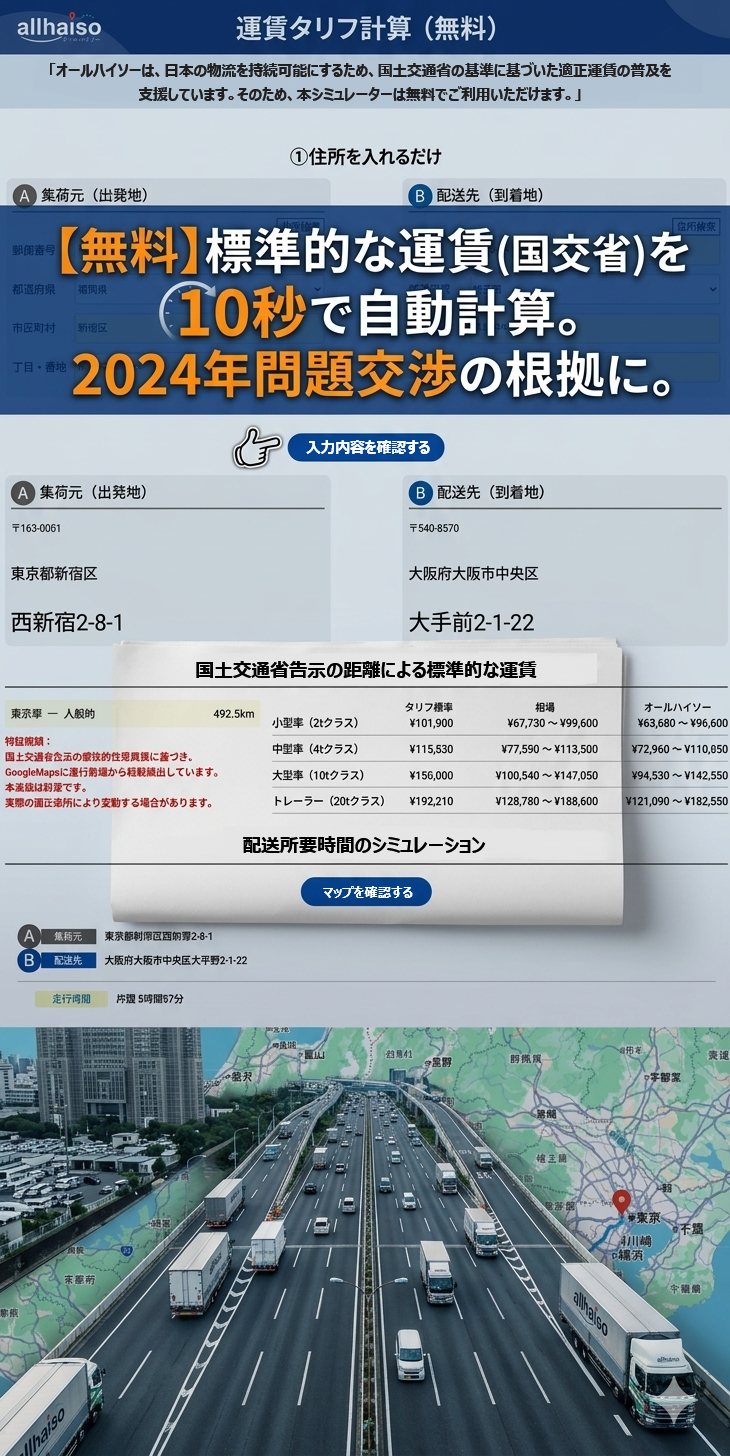 これを受け、allhaisoでは適正運賃を瞬時に算出・可視化できる新機能「運賃タリフ計算サポート」の無償提供を開始いたしました。